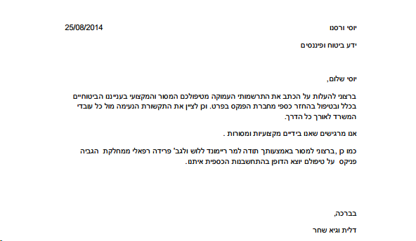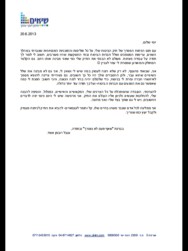 מכתב תודה ממנכ"לית "שיאים יעוץ עסקי" ענבל רובמן אשד
